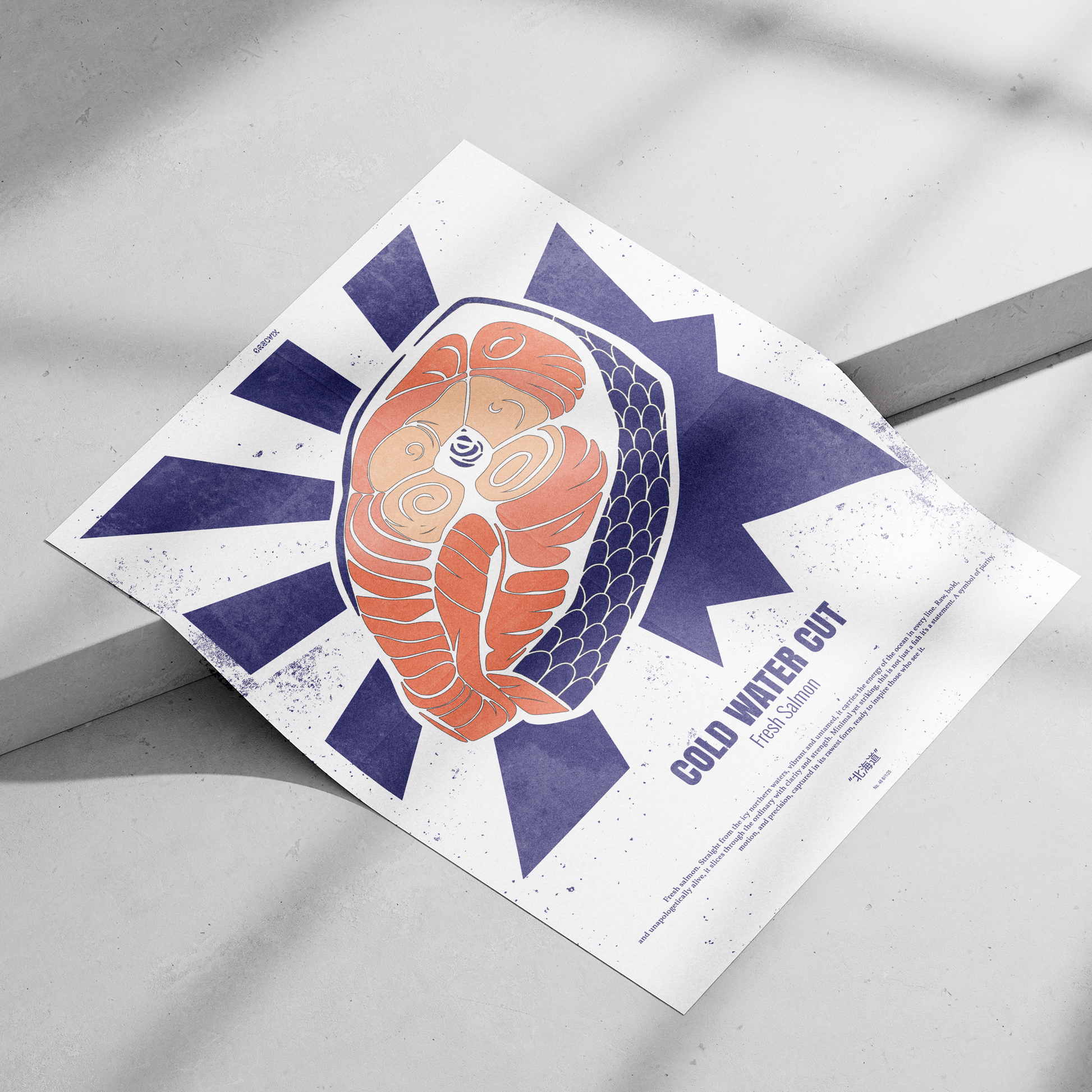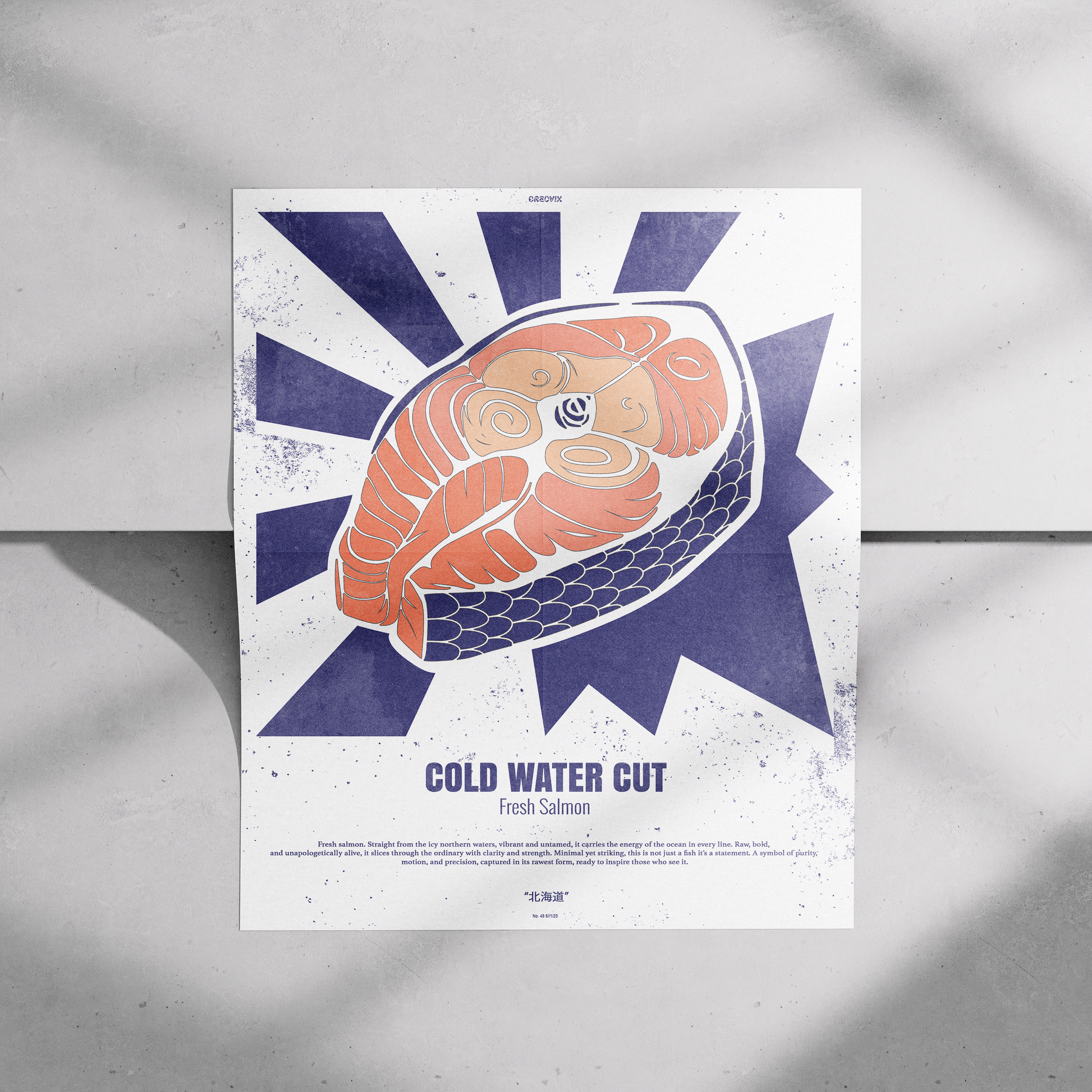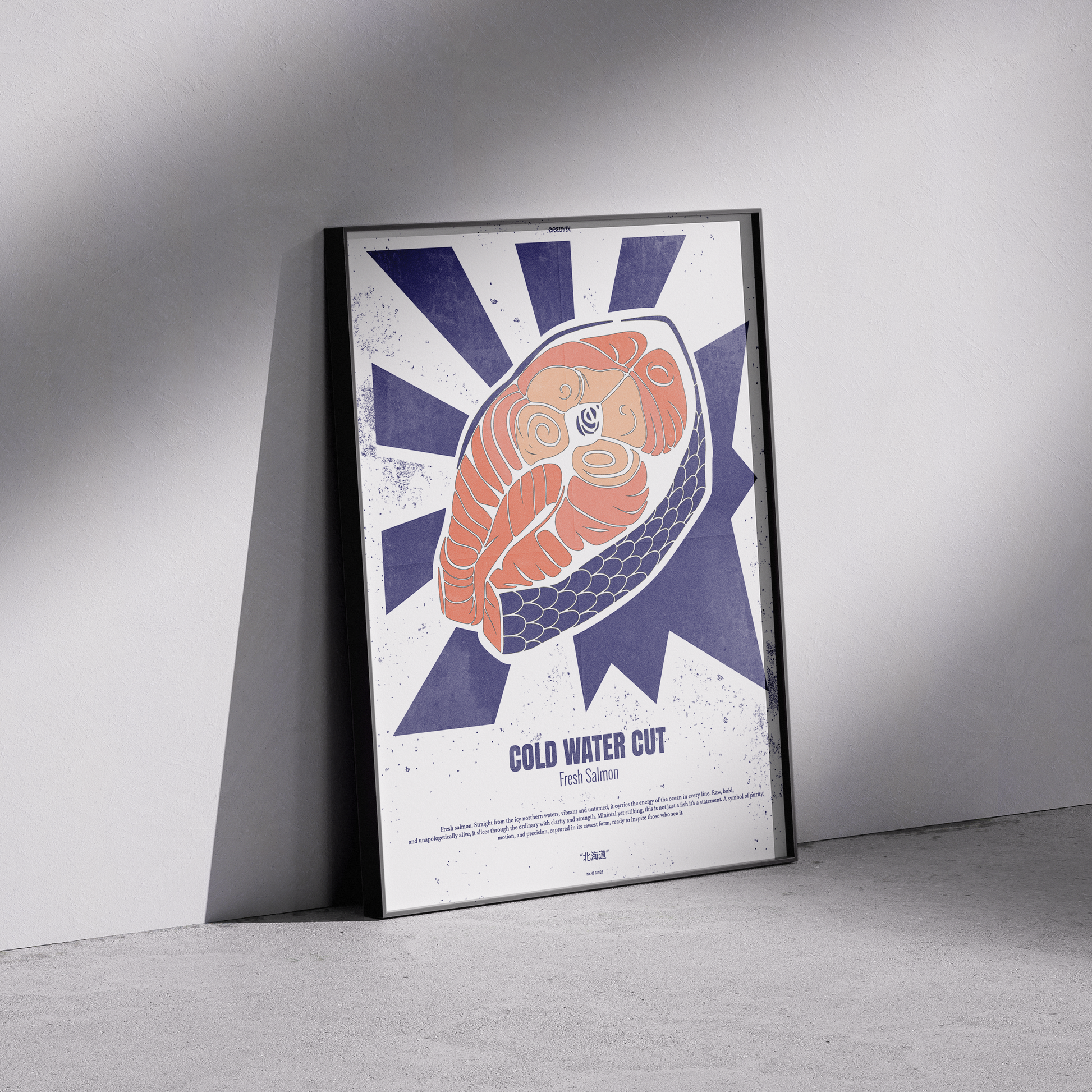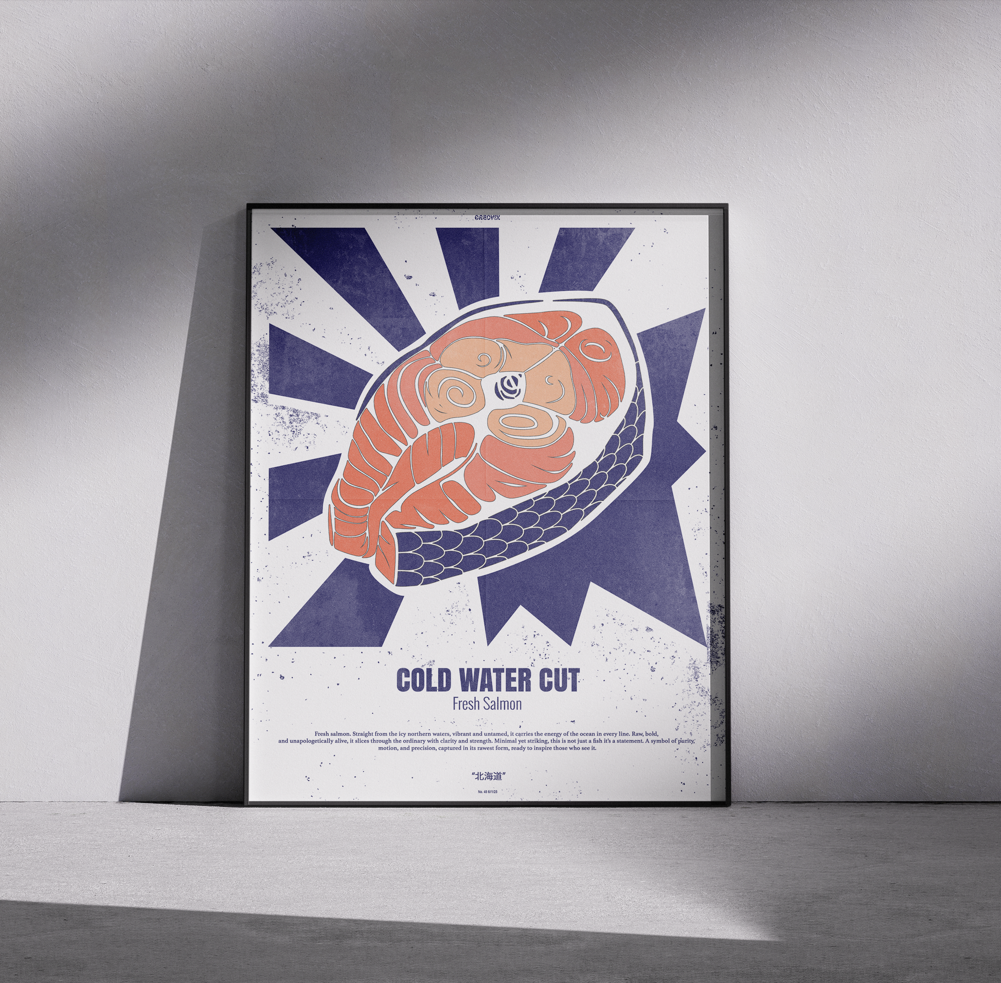 This poster brings playful, vintage-market energy to any kitchen, dining nook, or coastal cabin. The bold salmon illustration pops against angular sunburst lines, blending retro poster art with a modern, hand-printed feel. Choose satin for a lively sheen that makes the orange and navy sing, or archival matte for a softer, museum-quality finish that lets texture and detail take center stage. Hung above a butcher block, beside a spice rack, or in a gallery wall mix, it adds warmth and culinary personality without shouting for attention.